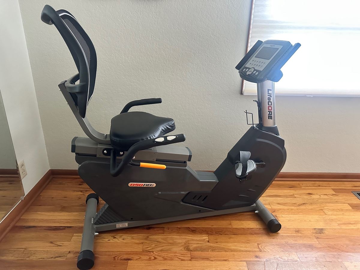 LifeCore 850RBs, recumbent stationary bike. 12 program profiles. Displays time, rpm/speed, distance, watt/calories. Quality, solidly built machine, like new, with user manual. $200 or make me an offer.